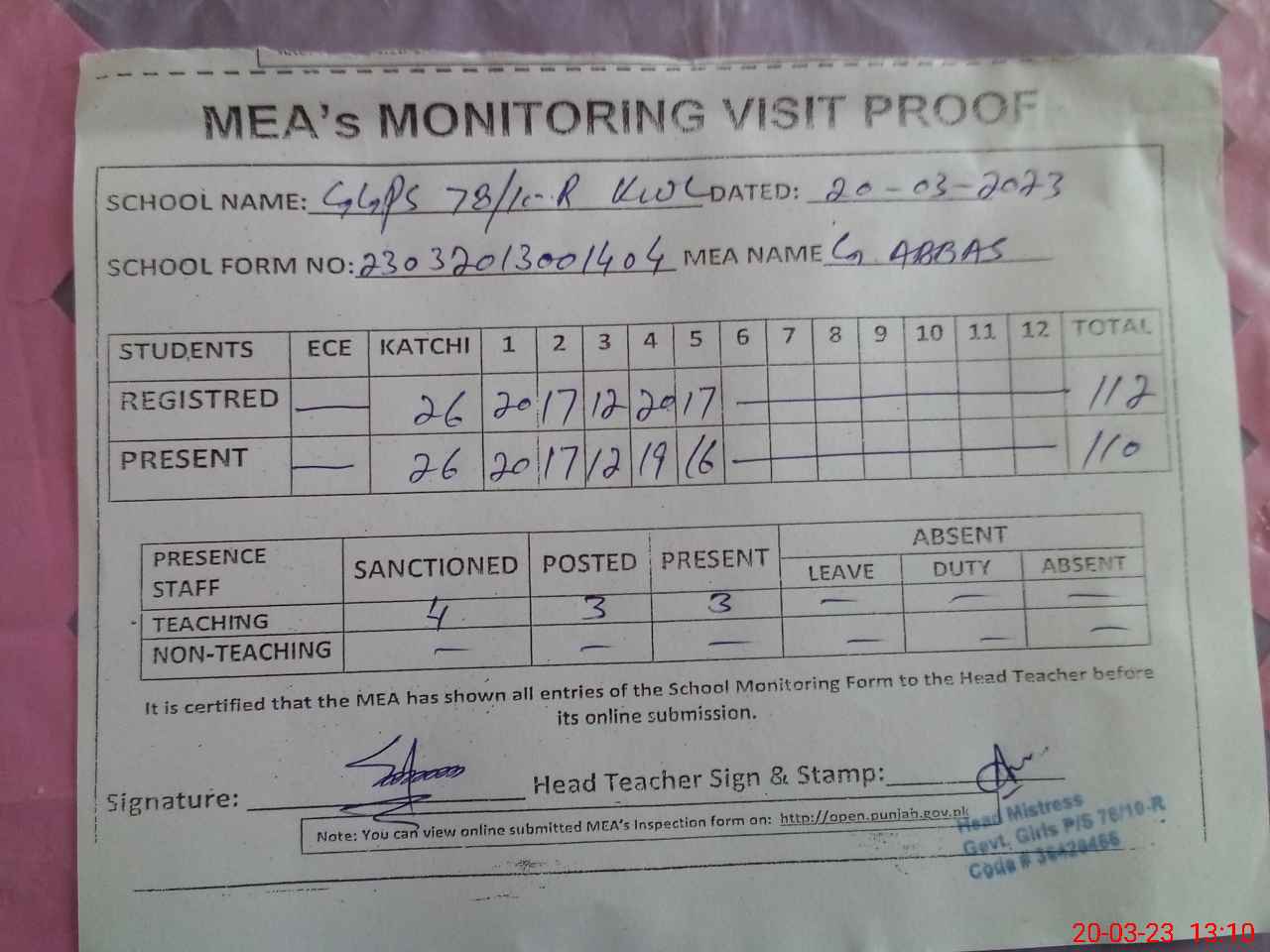 | Attendance Register | Head Teacher | MEA with School | Visit Proof |