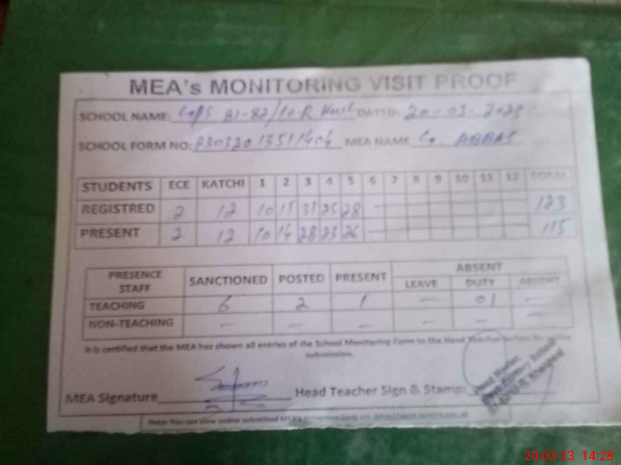 | Attendance Register | Head Teacher | MEA with School | Visit Proof |
