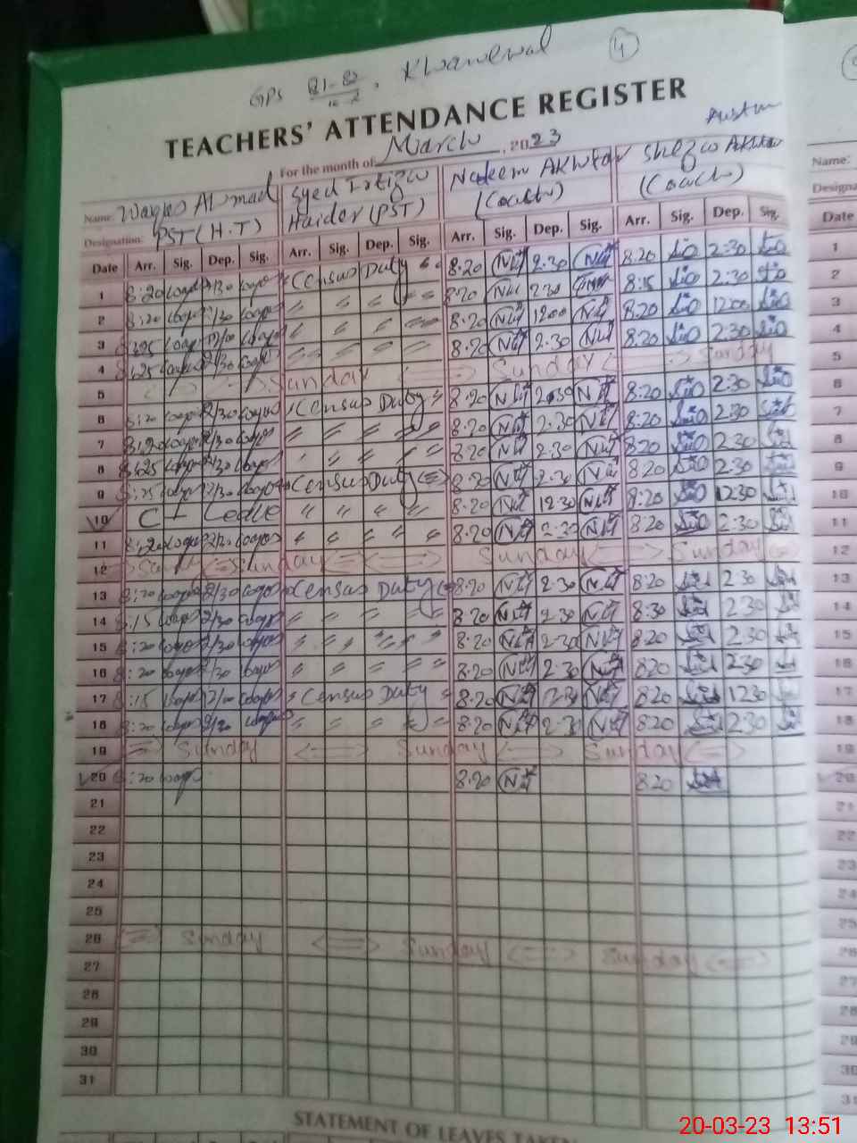 | CNIC | Full Name | Designation | R/C | Absence During Last Calender Month |