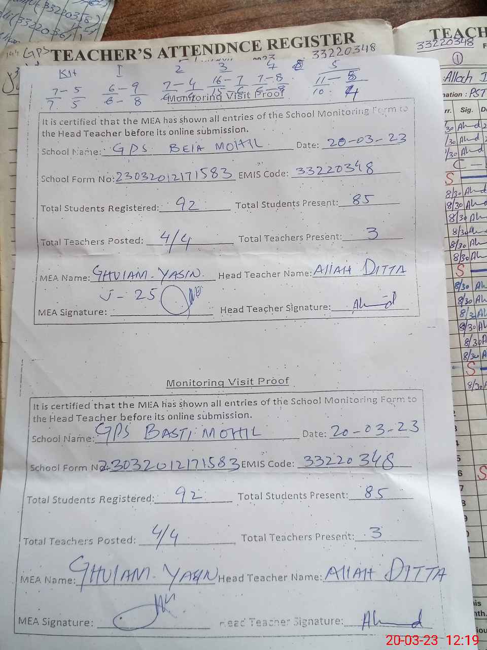 | Attendance Register | Head Teacher | MEA with School | Visit Proof |