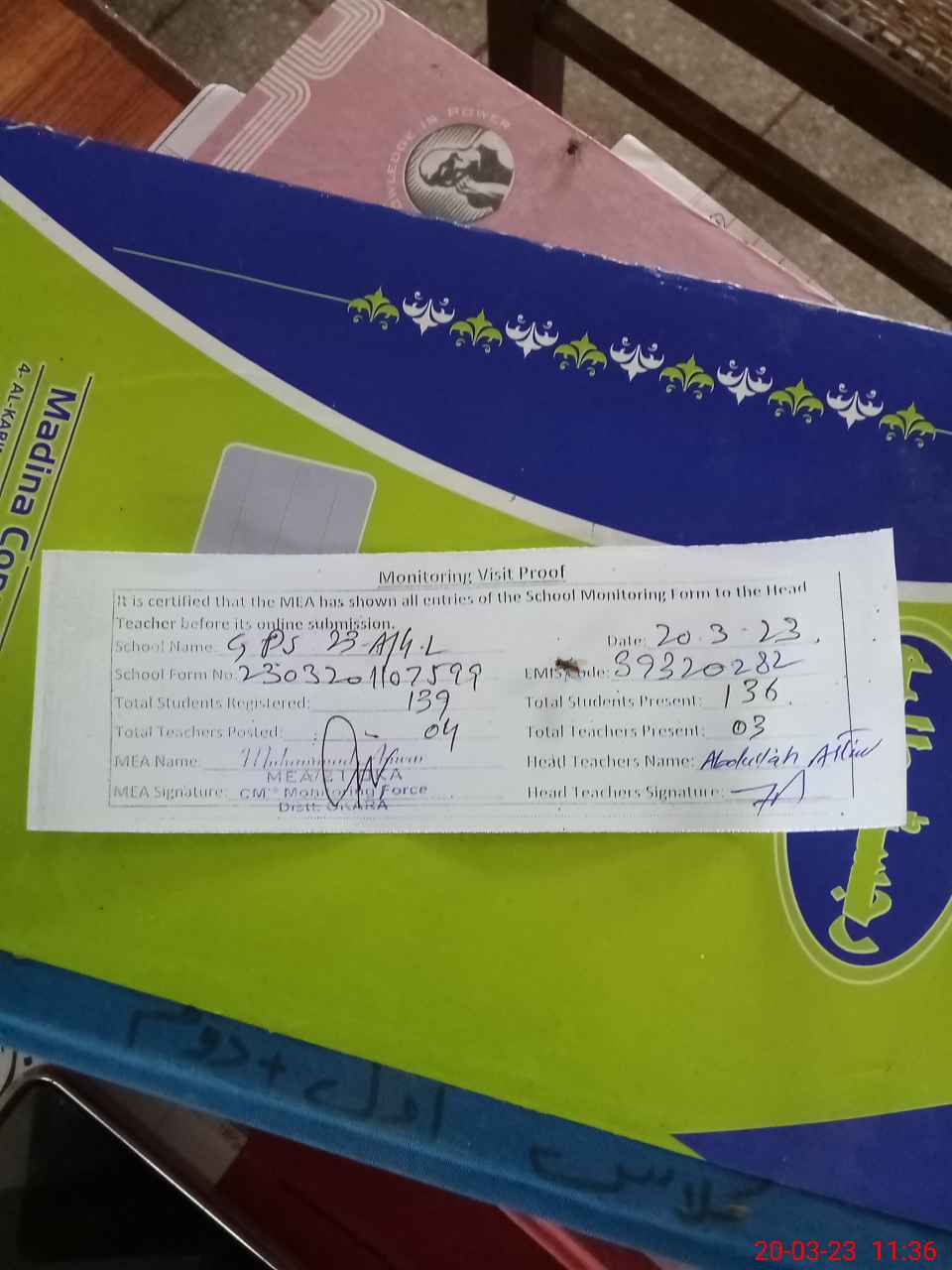 | Attendance Register | Head Teacher | MEA with School | Visit Proof |