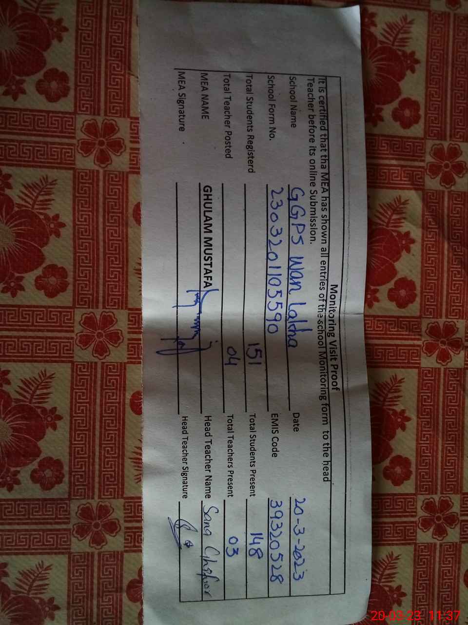| Attendance Register | Head Teacher | MEA with School | Visit Proof |