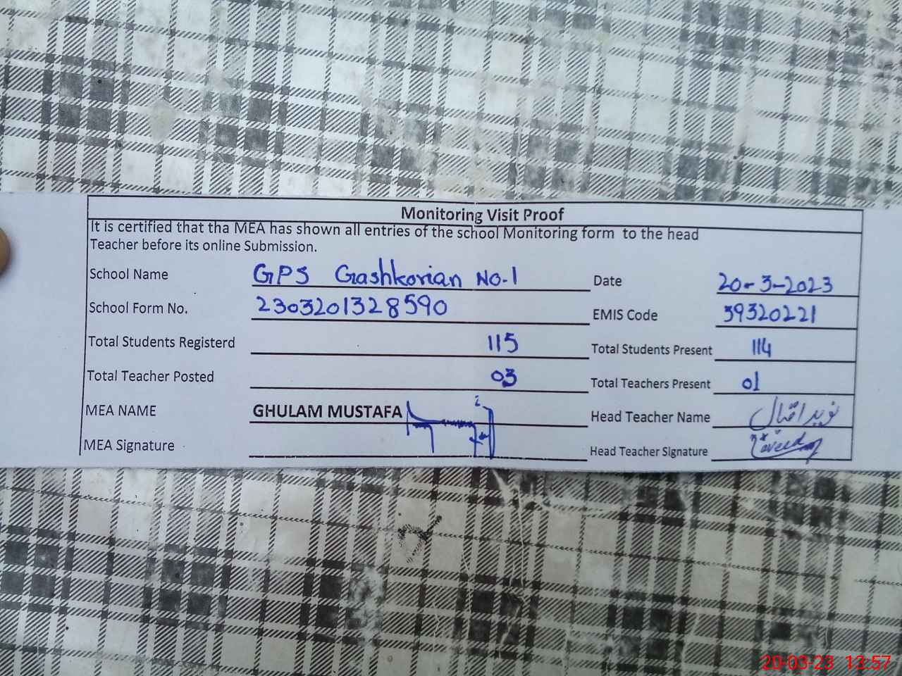 | Attendance Register | Head Teacher | MEA with School | Visit Proof |