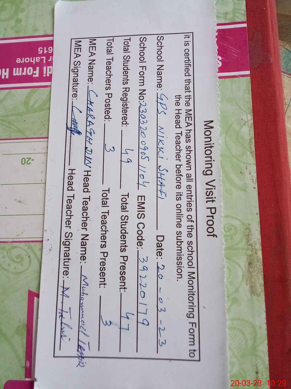 | Attendance Register | Head Teacher | MEA with School | Visit Proof |