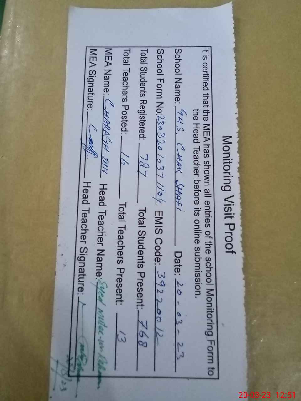 | EMIS Code: 39220012 | Name of School: GHS CHAK SHAFI | |||