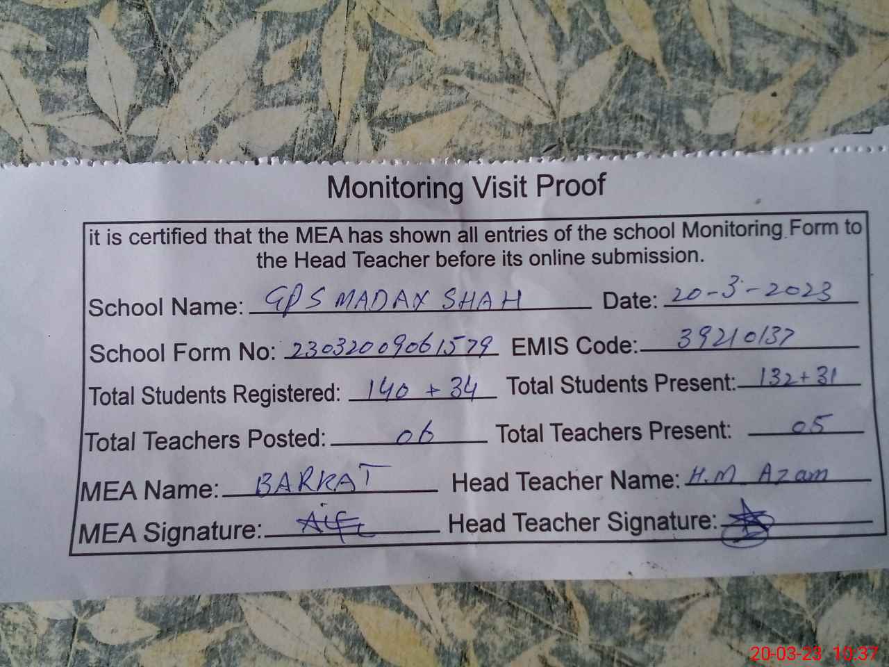 | Attendance Register | Head Teacher | MEA with School | Visit Proof |