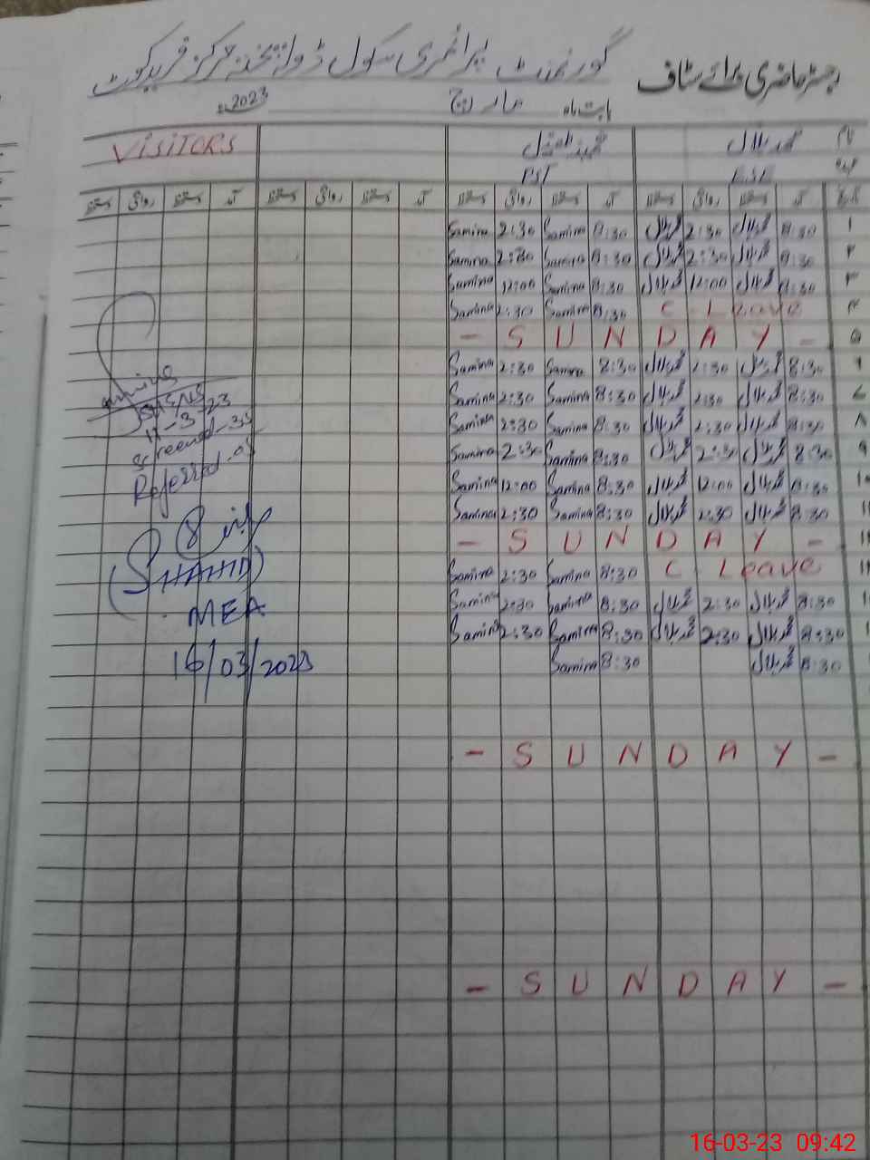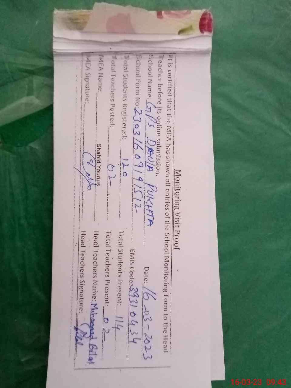 | Attendance Register | Head Teacher | MEA with School | Visit Proof |