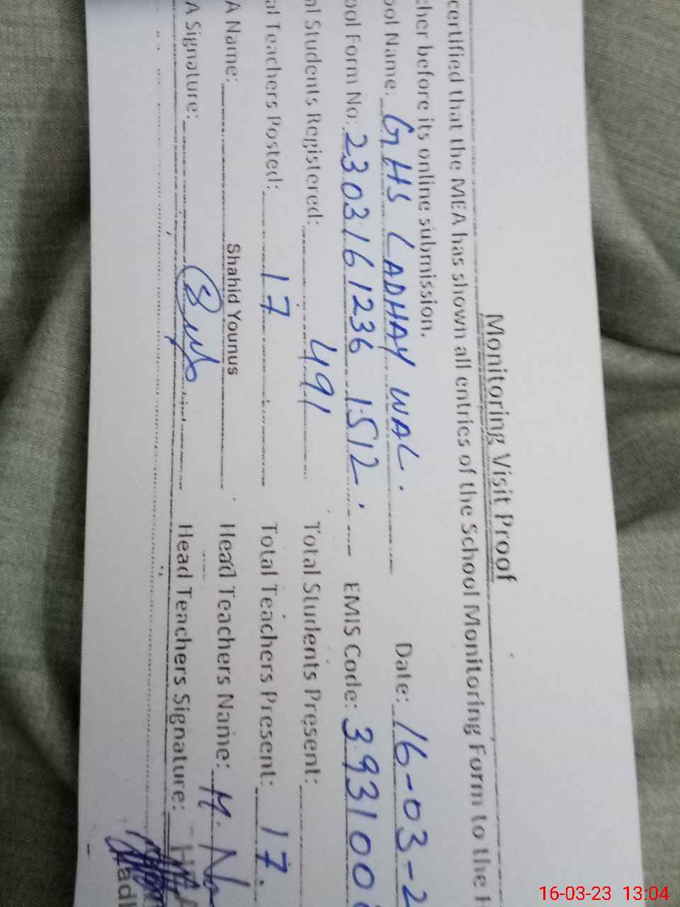 | Name: MNa**** Designation: (School Headmaster's/Headmistress's) HEADMASTER Phone/Cell Number: 03**** |