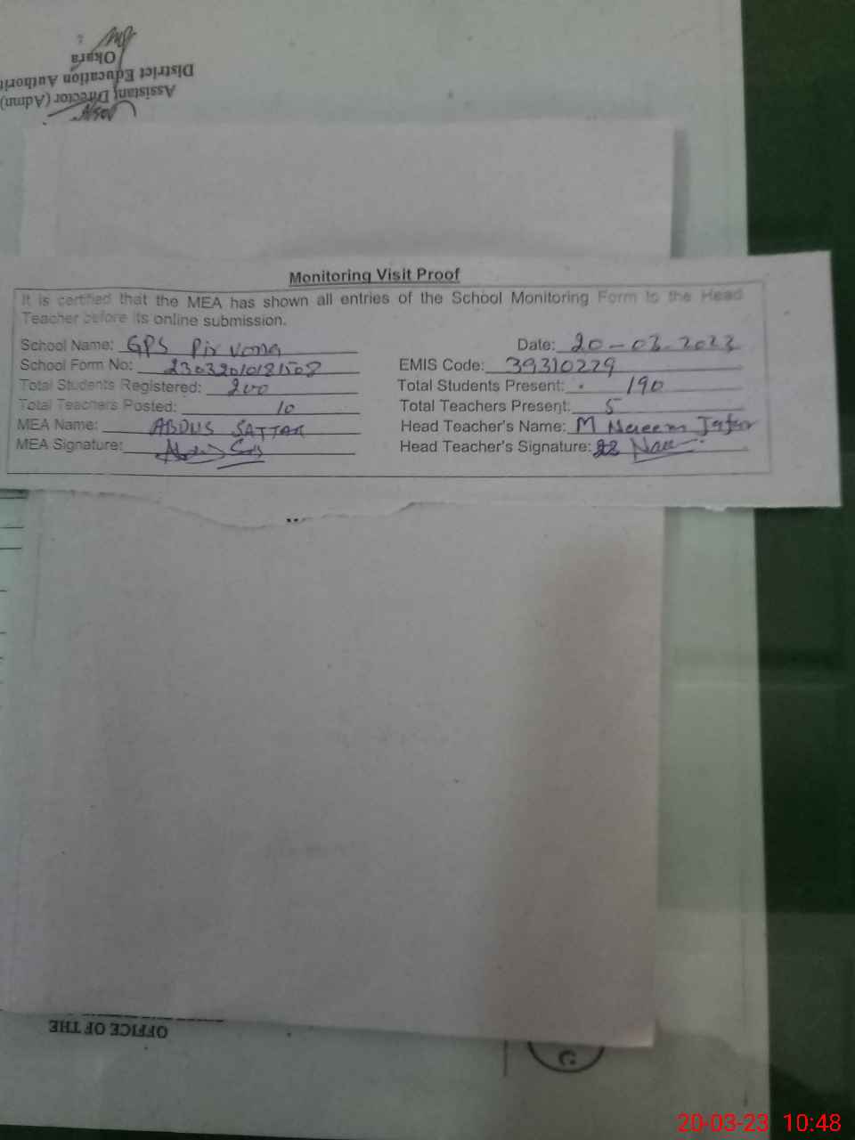 | Certified that this School was Inspected by the Undersigned MEA/DMO Today and the Information Stated Above is as Per Record. | |||||