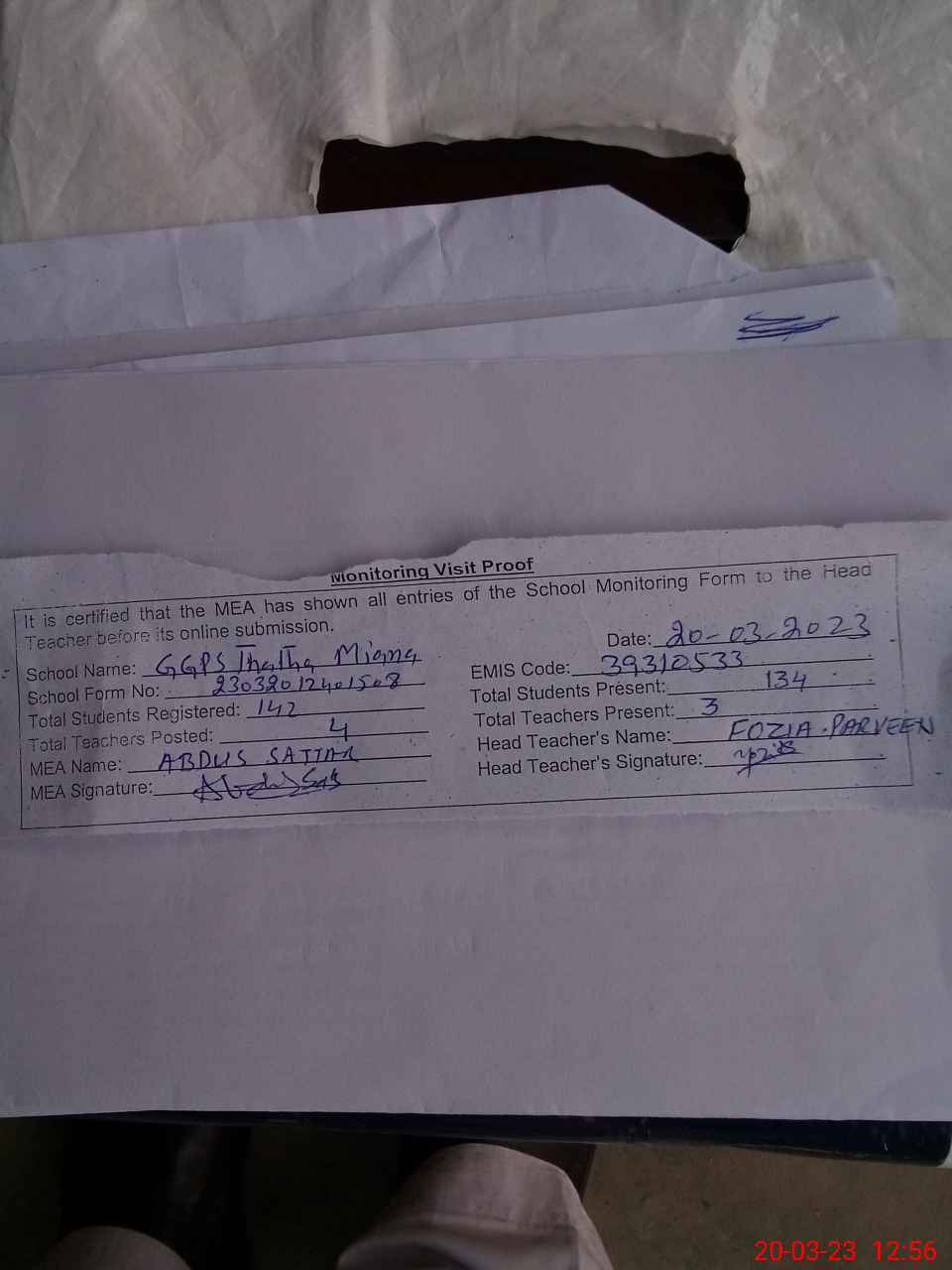 | Attendance Register | Head Teacher | MEA with School | Visit Proof |