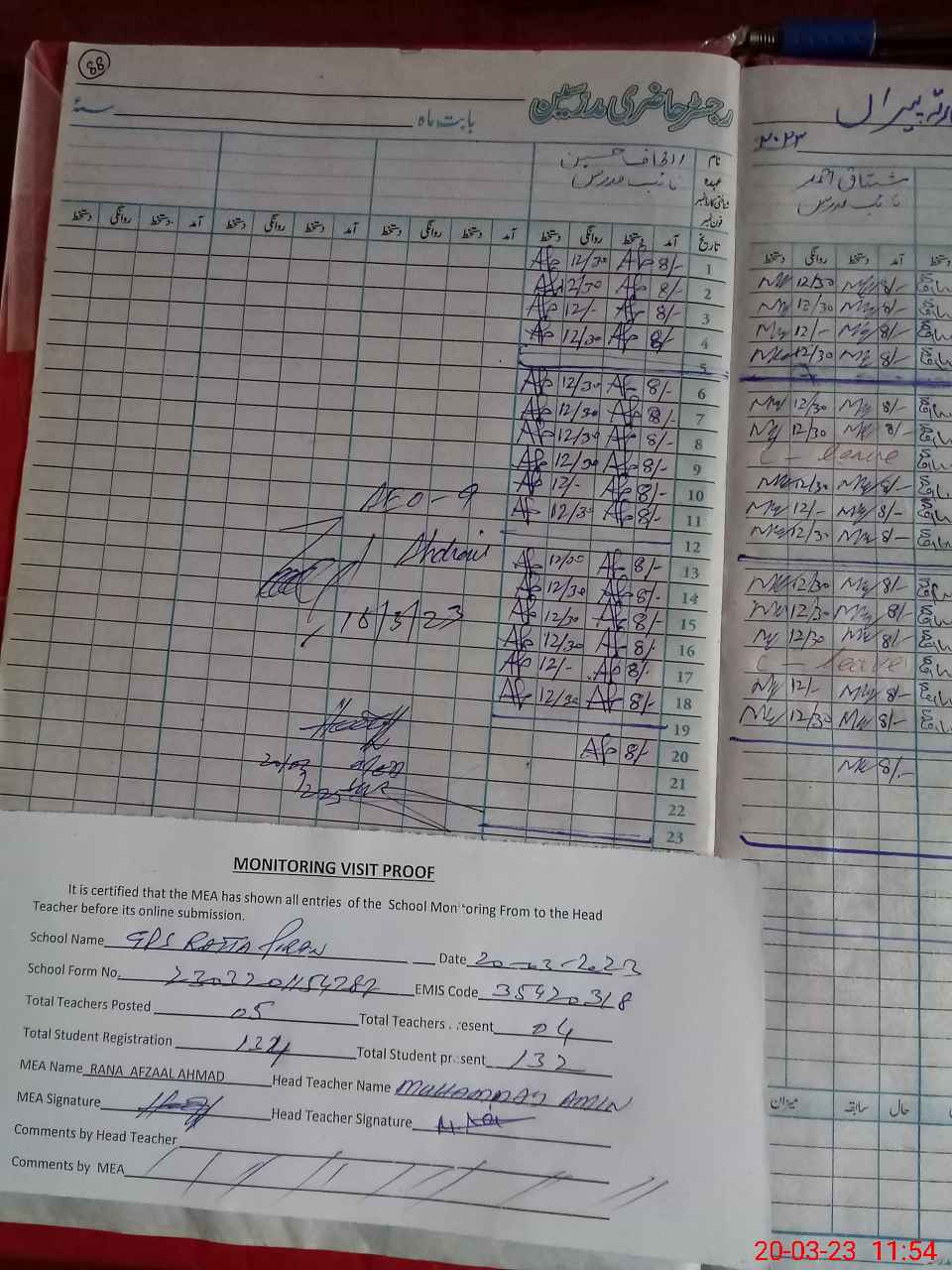 | Attendance Register | Head Teacher | MEA with School | Visit Proof |