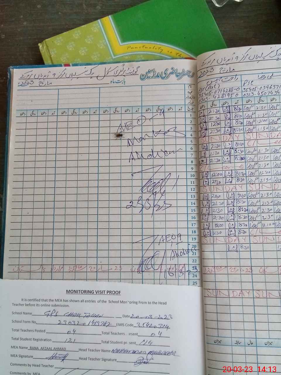 | Attendance Register | Head Teacher | MEA with School | Visit Proof |