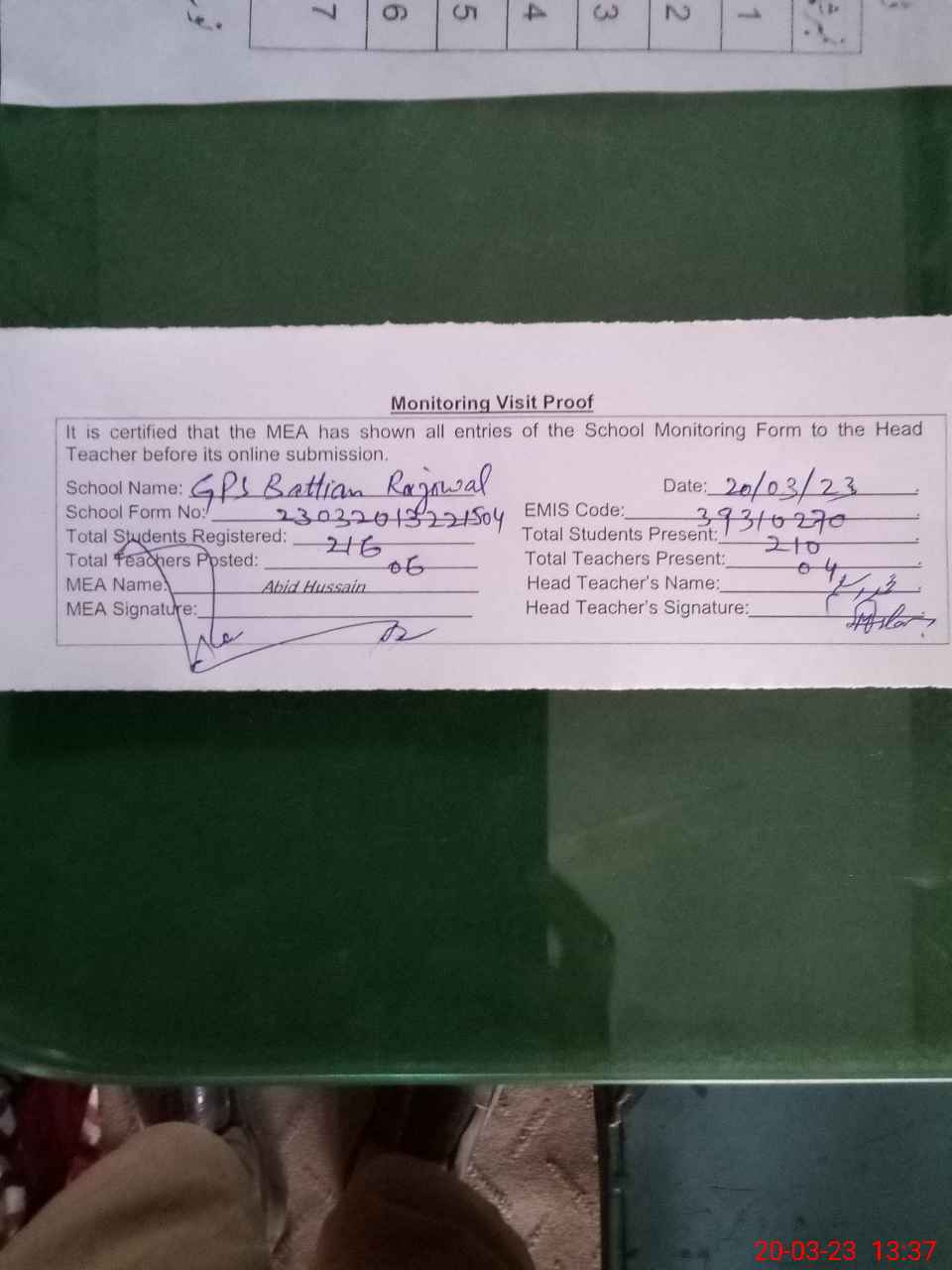 | Attendance Register | Head Teacher | MEA with School | Visit Proof |