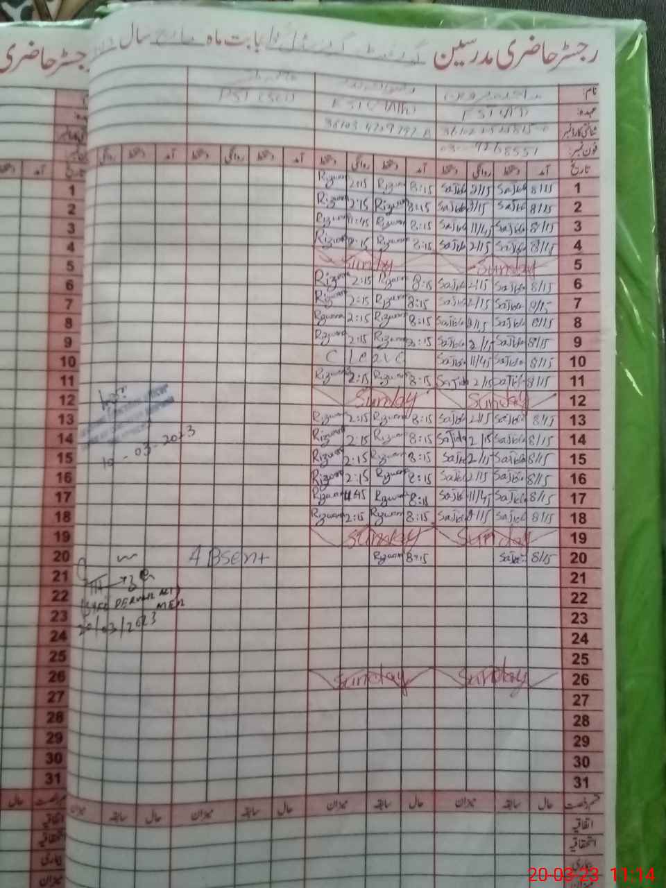 | Remarks (Use Separate Page if Required): 1 PST Asima Zafar absent from school with out leave | |||||