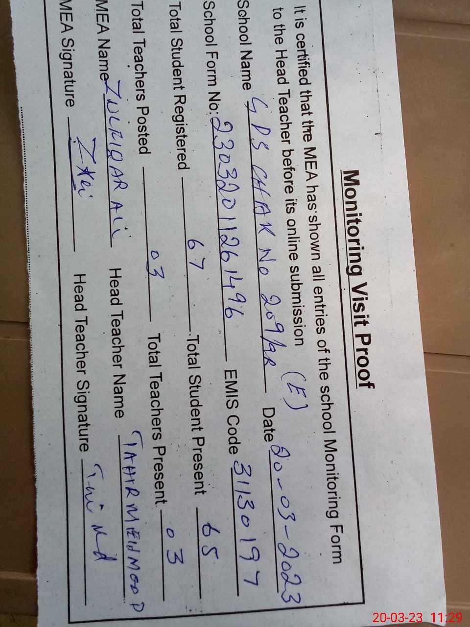 | EMIS Code: 31130197 | Name of School: GPS CHAK NO. 209/9-R SHARQI | |||
