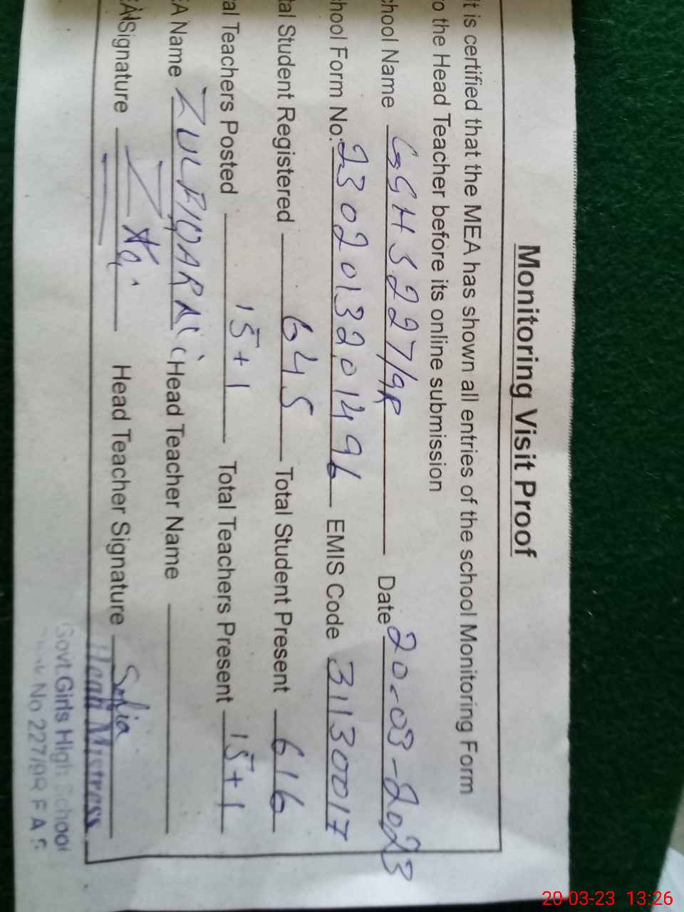 | Attendance Register | Head Teacher | MEA with School | Visit Proof |