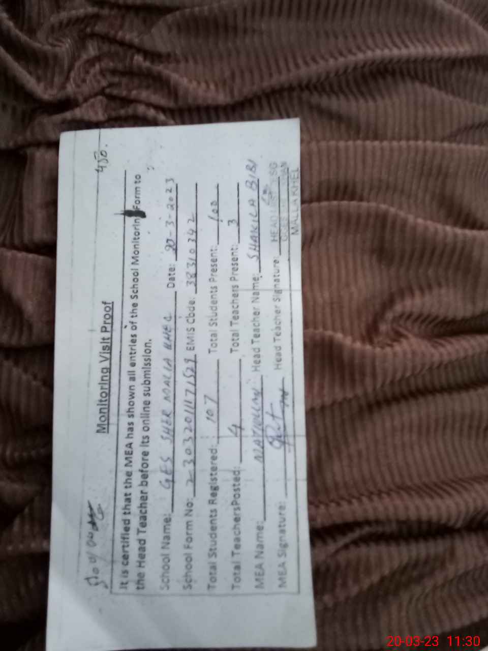 | Attendance Register | Head Teacher | MEA with School | Visit Proof |