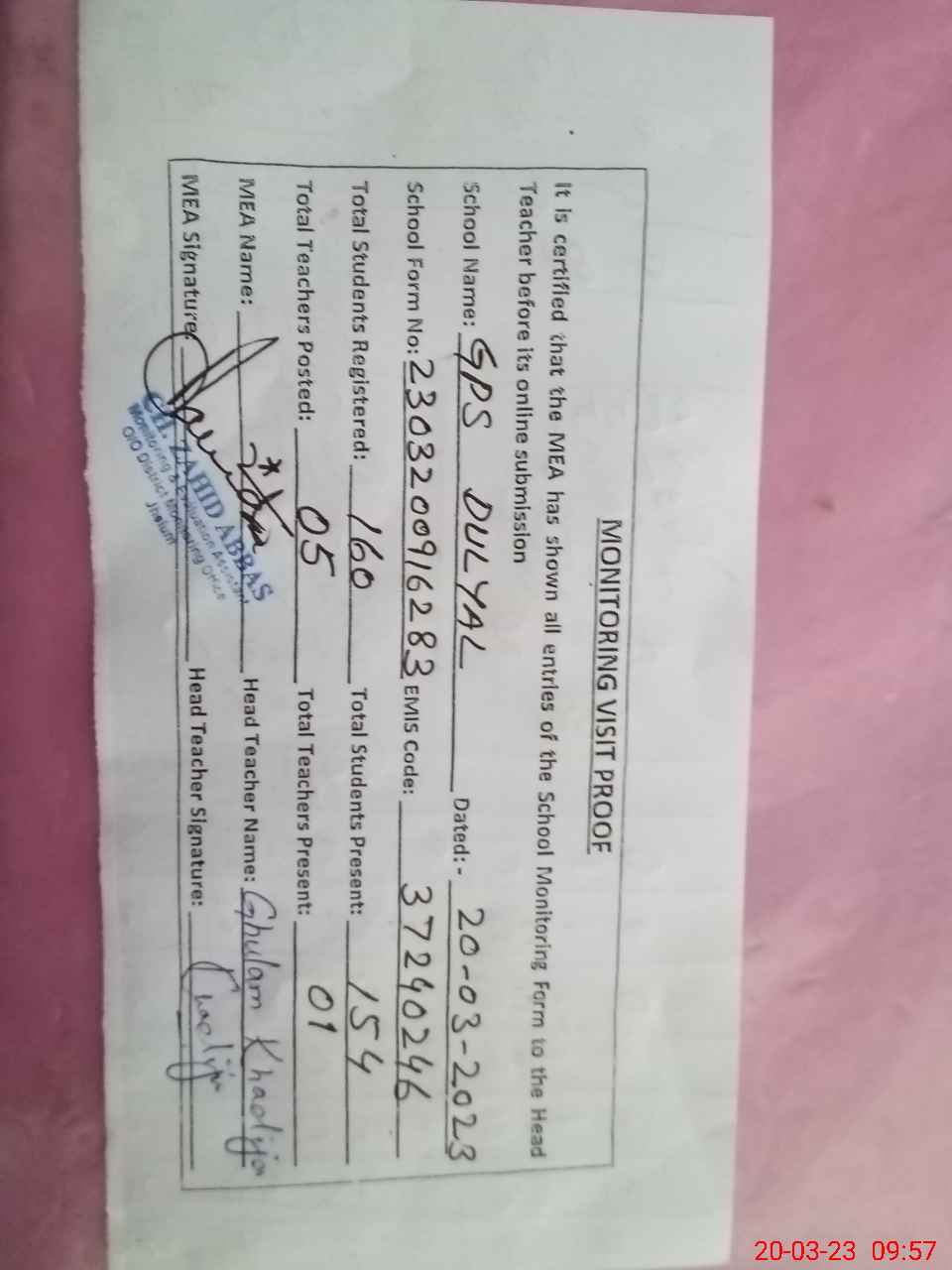 | Attendance Register | Head Teacher | MEA with School | Visit Proof |