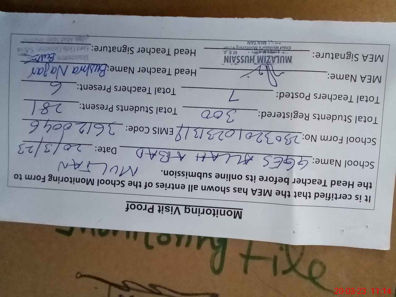 | Attendance Register | Head Teacher | MEA with School | Visit Proof |