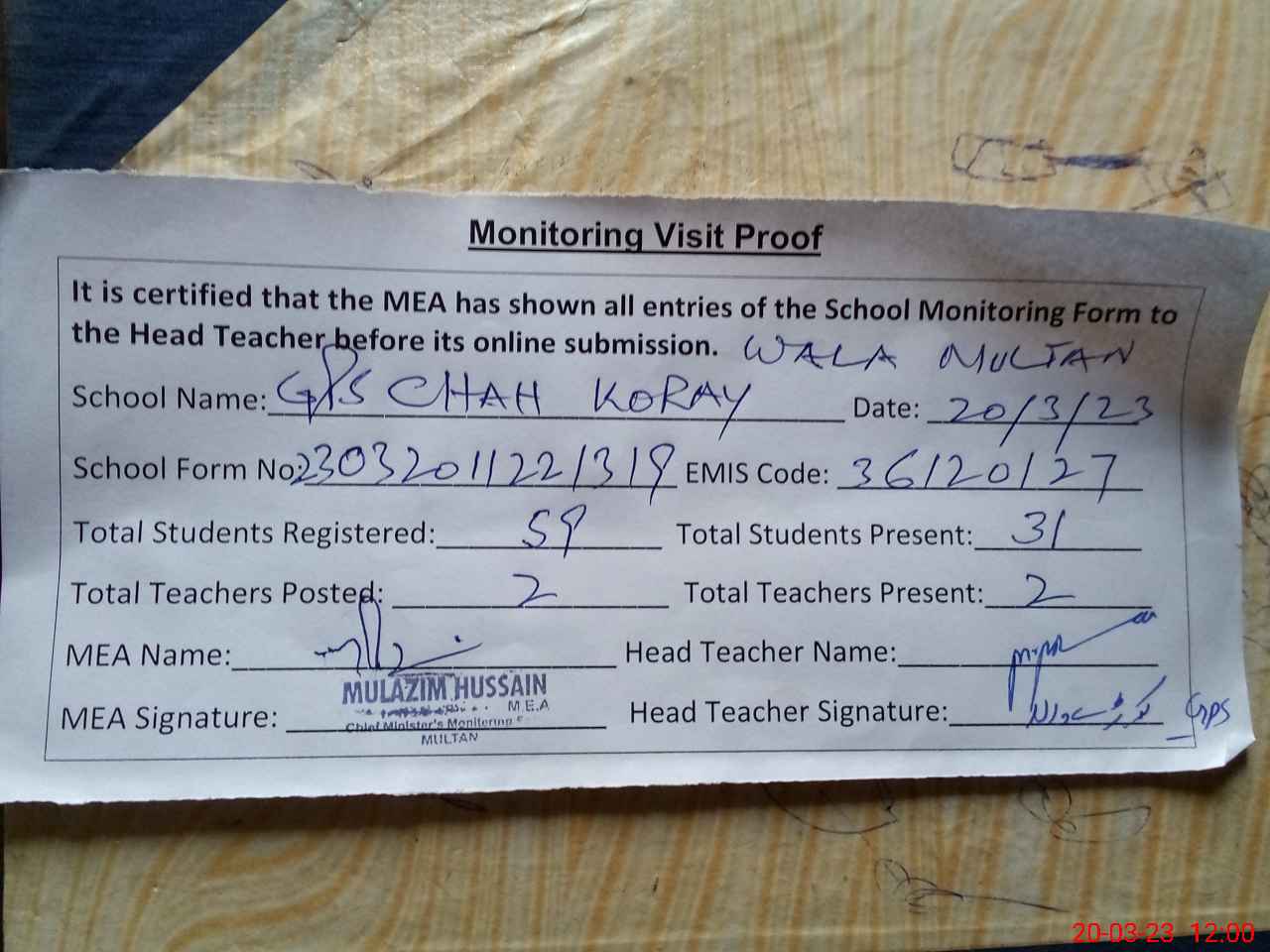| Attendance Register | Head Teacher | MEA with School | Visit Proof |