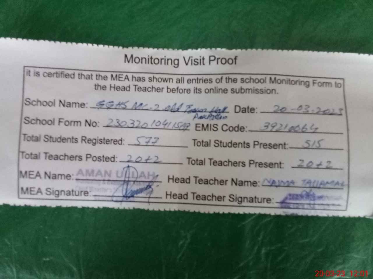 | Attendance Register | Head Teacher | MEA with School | Visit Proof |