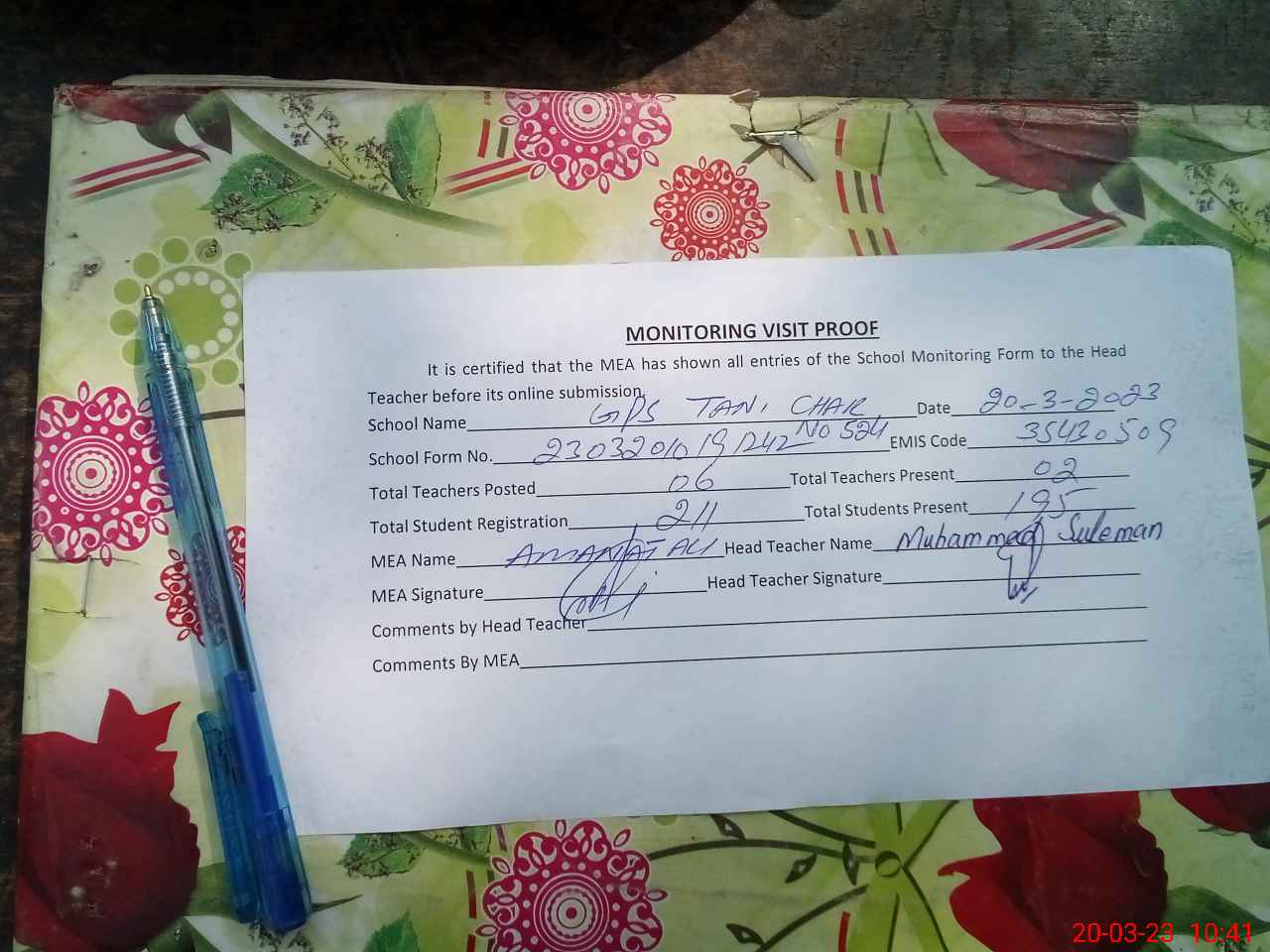| Attendance Register | Head Teacher | MEA with School | Visit Proof |