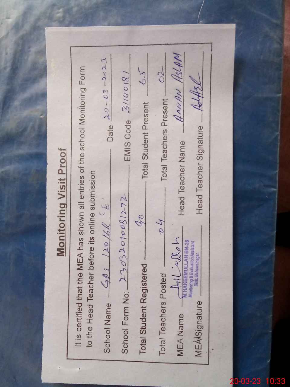 | Attendance Register | Head Teacher | MEA with School | Visit Proof |