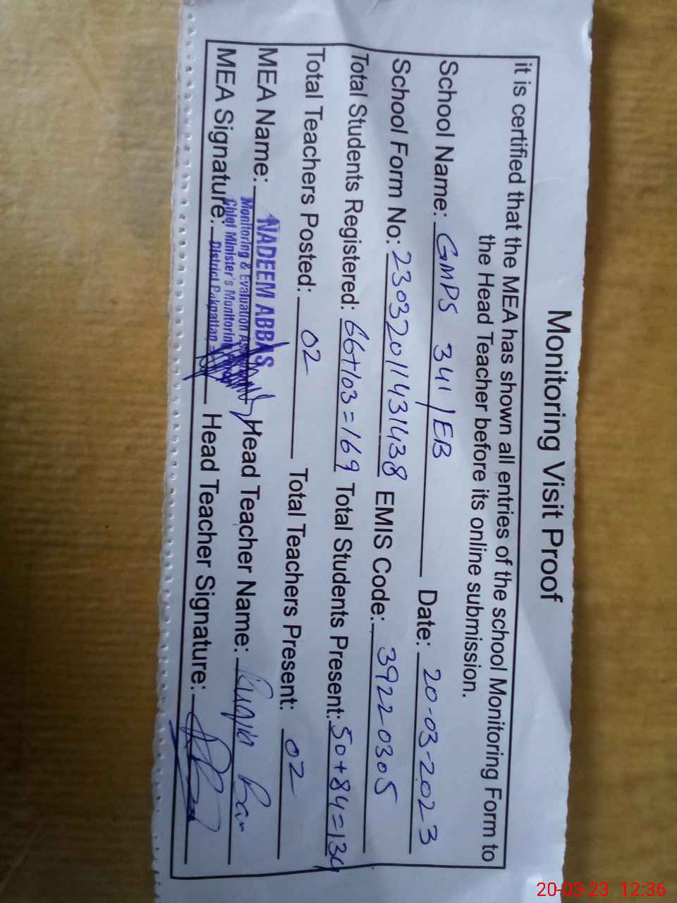 | Attendance Register | Head Teacher | MEA with School | Visit Proof |