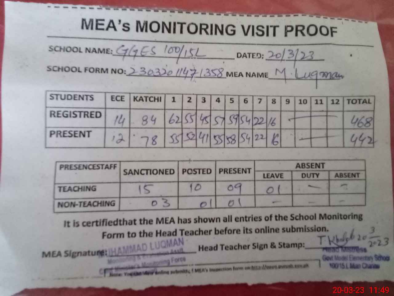 | Attendance Register | Head Teacher | MEA with School | Visit Proof |