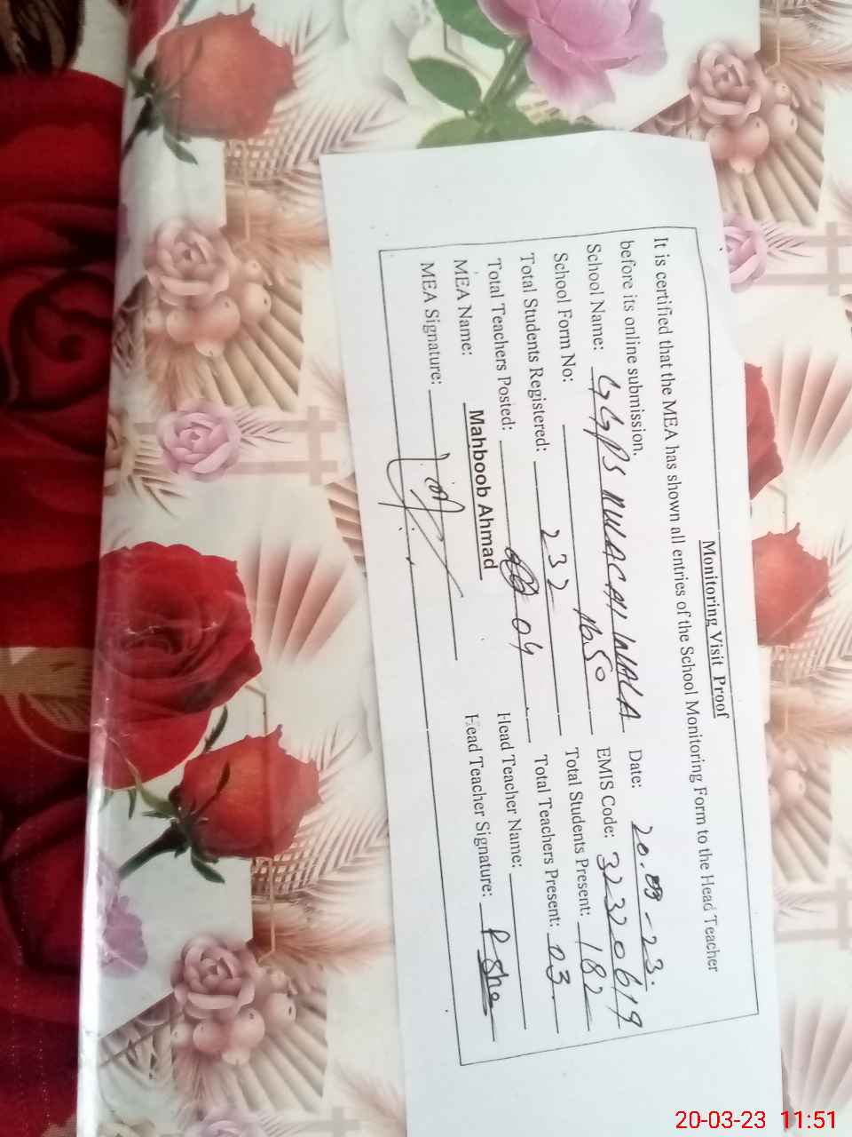 | Attendance Register | Head Teacher | MEA with School | Visit Proof |