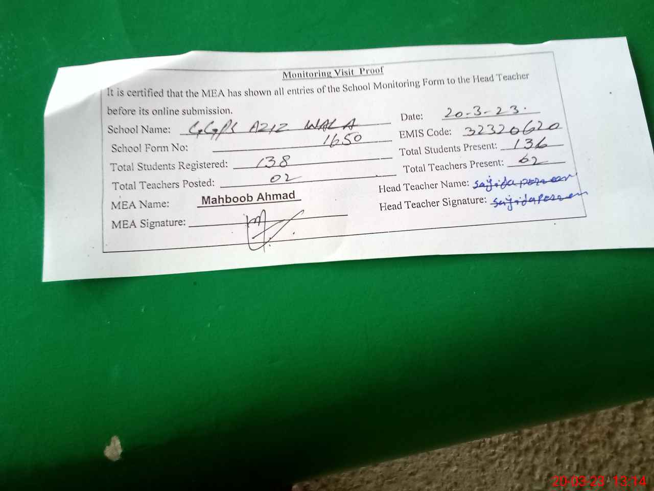 | EMIS Code: 32320620 | Name of School: GGPS AZIZ WALA | |||