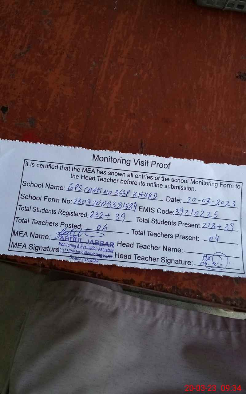 | EMIS Code: 39210225 | Name of School: GPS CHAK NO. 36/SP KHURD | |||