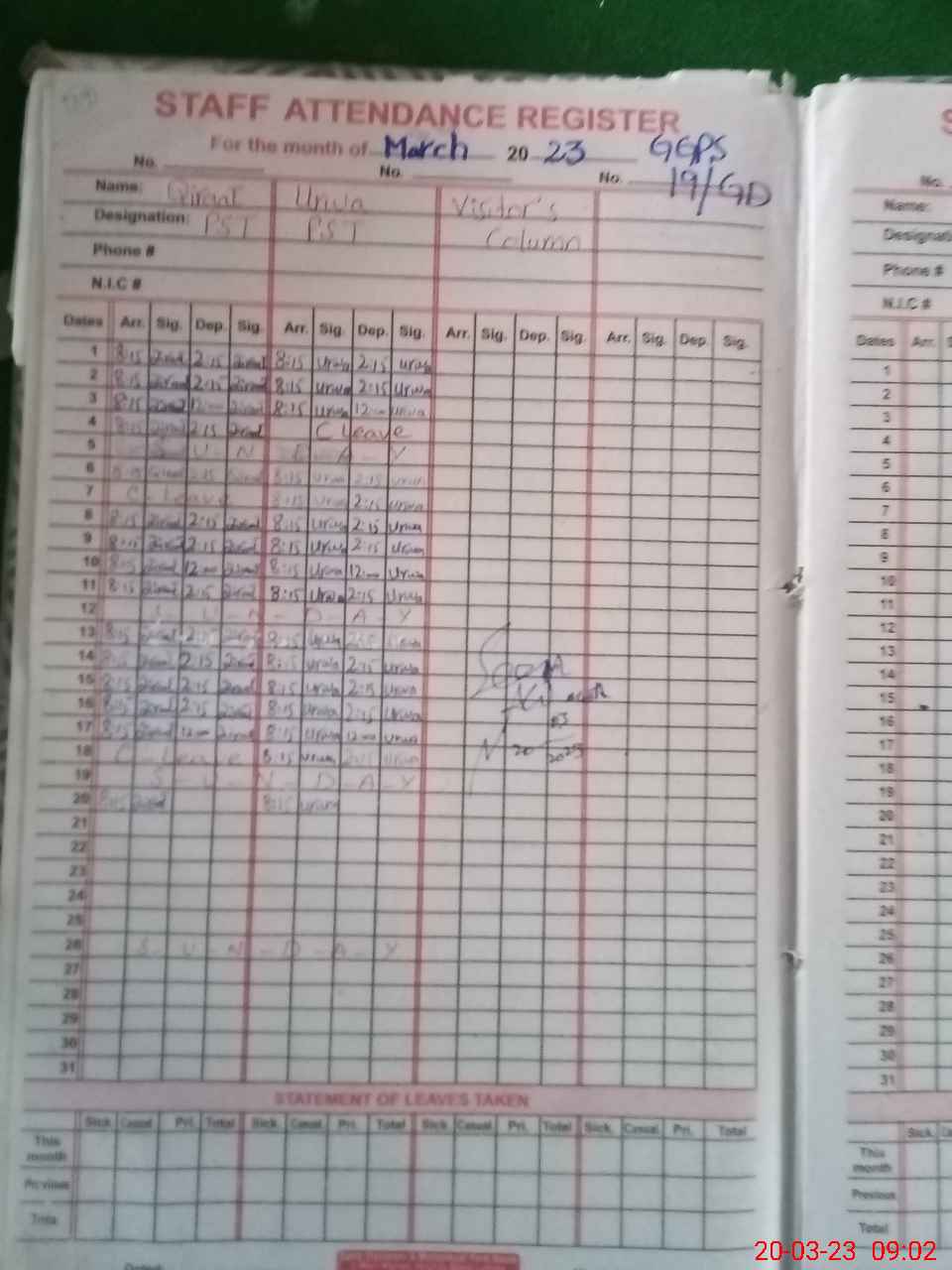 | CNIC | Full Name | Designation | R/C | Absence During Last Calender Month |