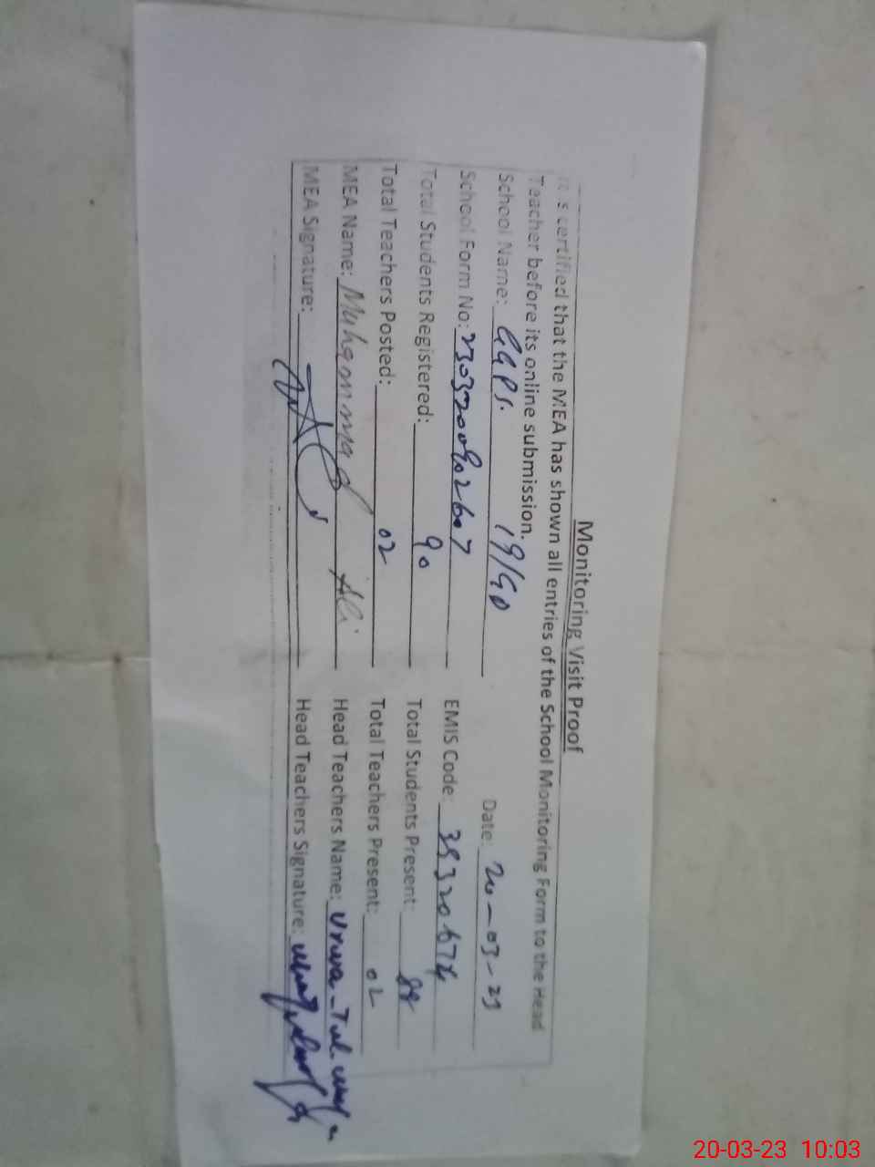| Attendance Register | Head Teacher | MEA with School | Visit Proof |