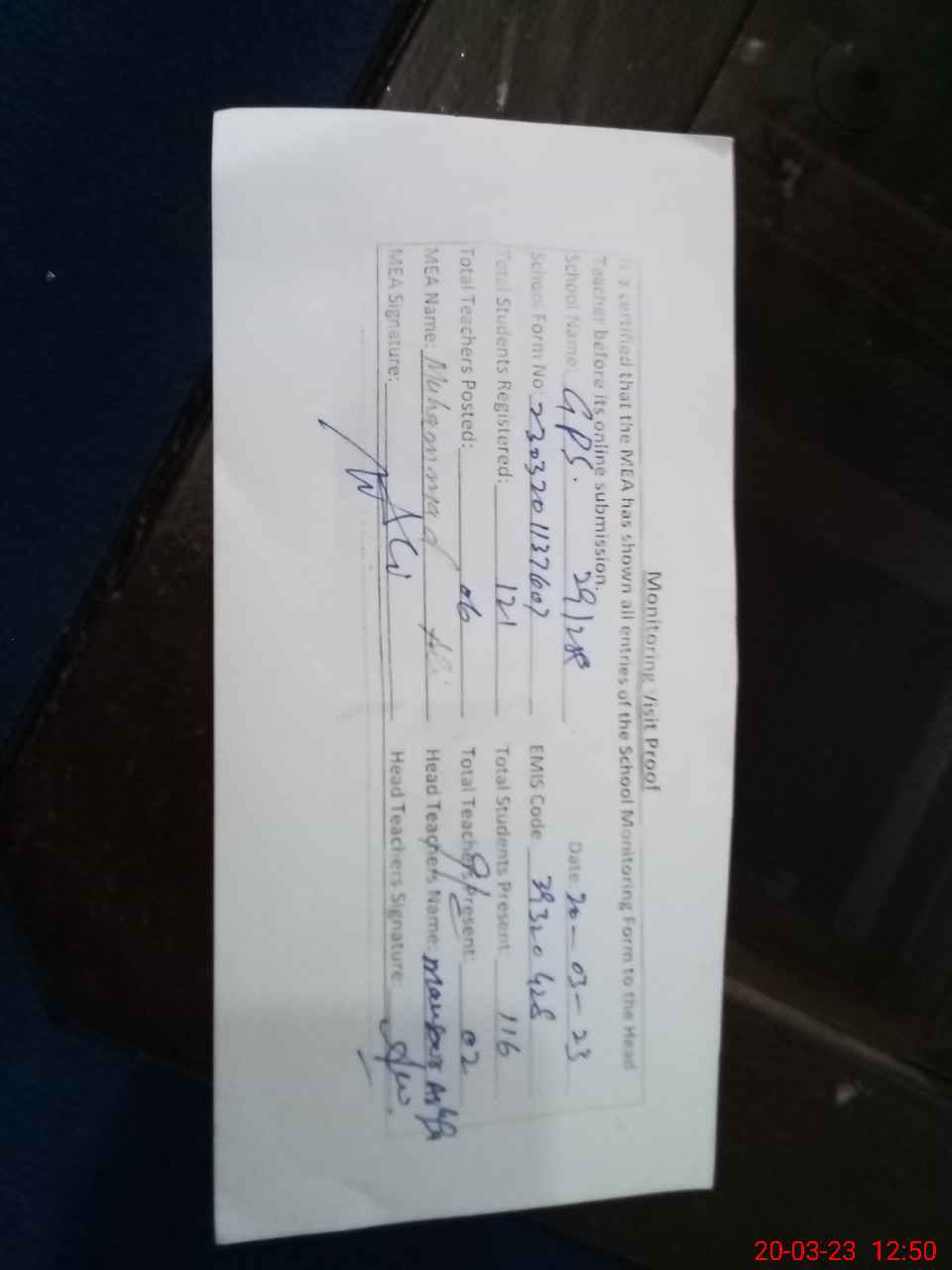 | Attendance Register | Head Teacher | MEA with School | Visit Proof |