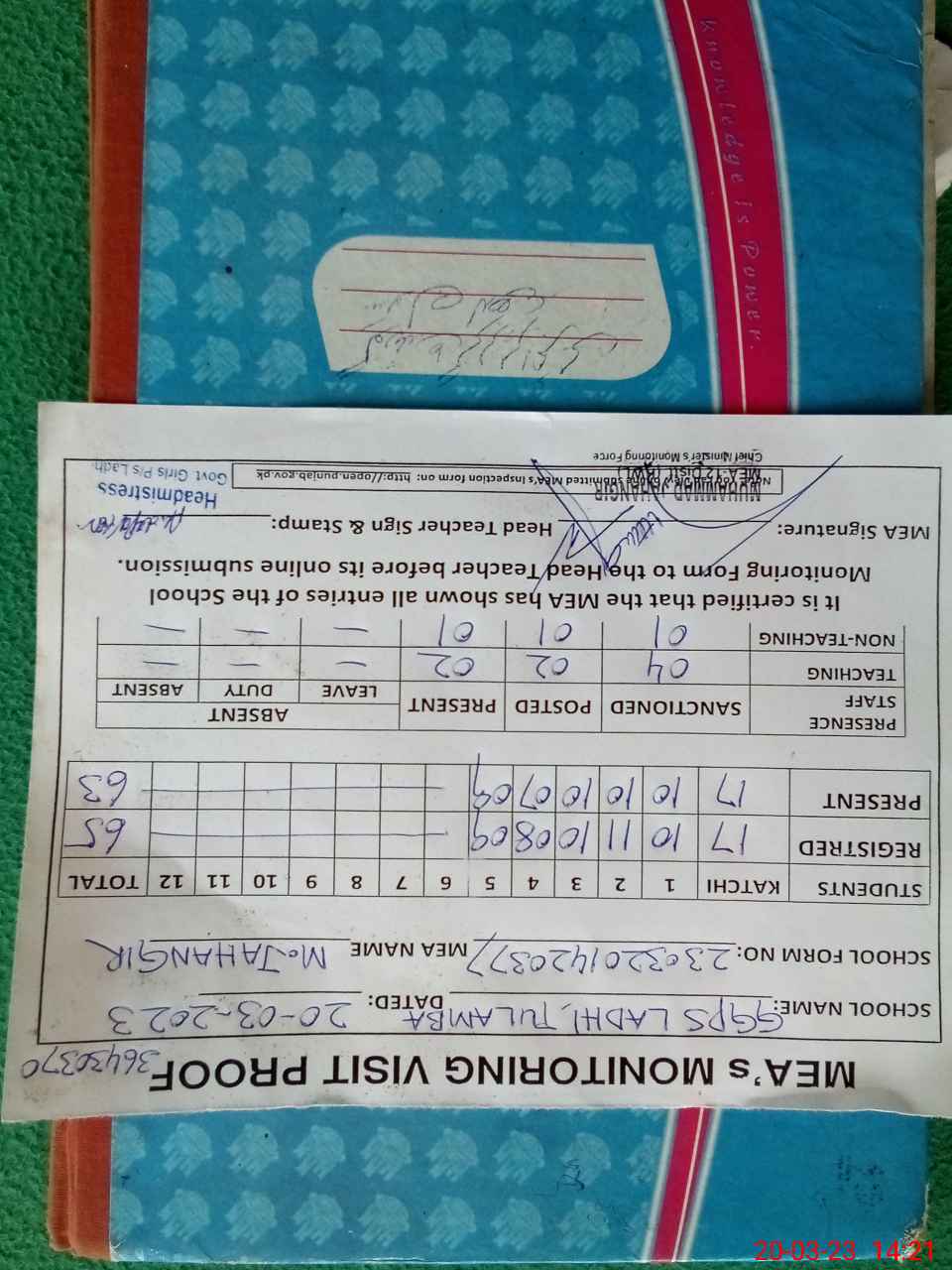 | Attendance Register | Head Teacher | MEA with School | Visit Proof |
