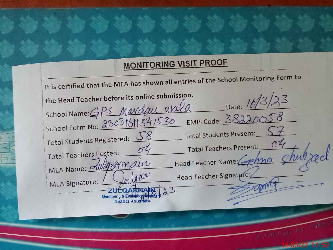 | EMIS Code: 38220058 | Name of School: GPS MARDAN WALA | |||