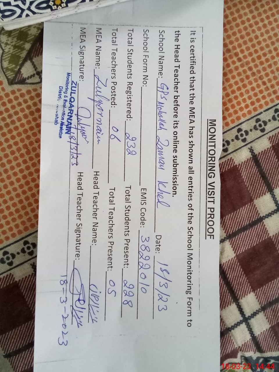 | EMIS Code: 38220104 | Name of School: GPS MOHALLAH ZAMAN KHAIL | |||