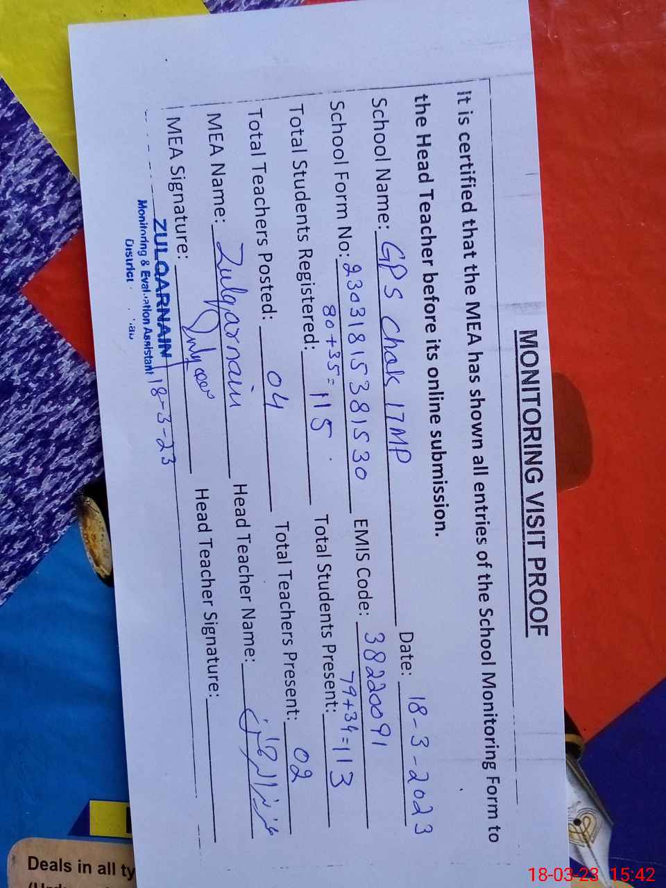 | Attendance Register | Head Teacher | MEA with School | Visit Proof |