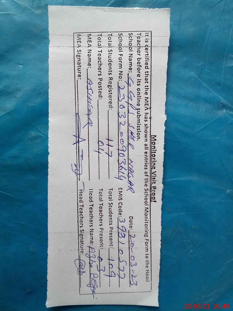 | Attendance Register | Head Teacher | MEA with School | Visit Proof |