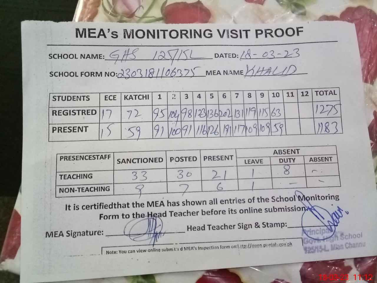 | Attendance Register | Head Teacher | MEA with School | Visit Proof |