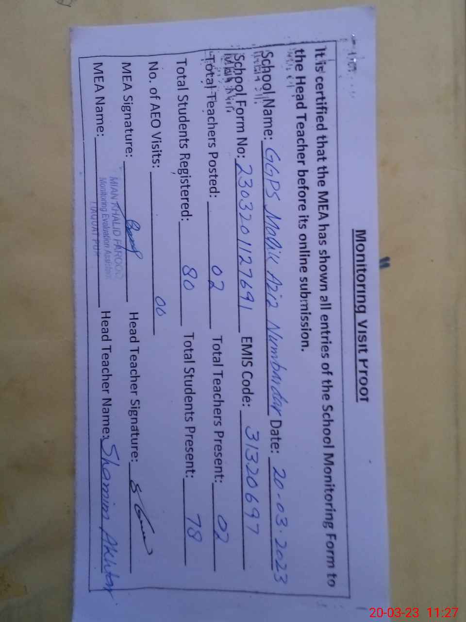 | EMIS Code: 31320697 | Name of School: GGPS MALIK AZIZ NUMBERDAR | |||