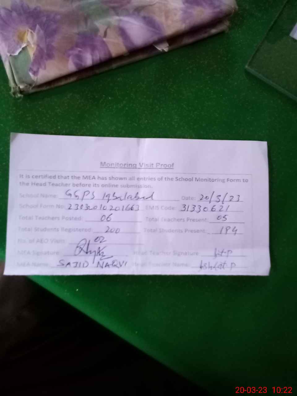 | Attendance Register | Head Teacher | MEA with School | Visit Proof |