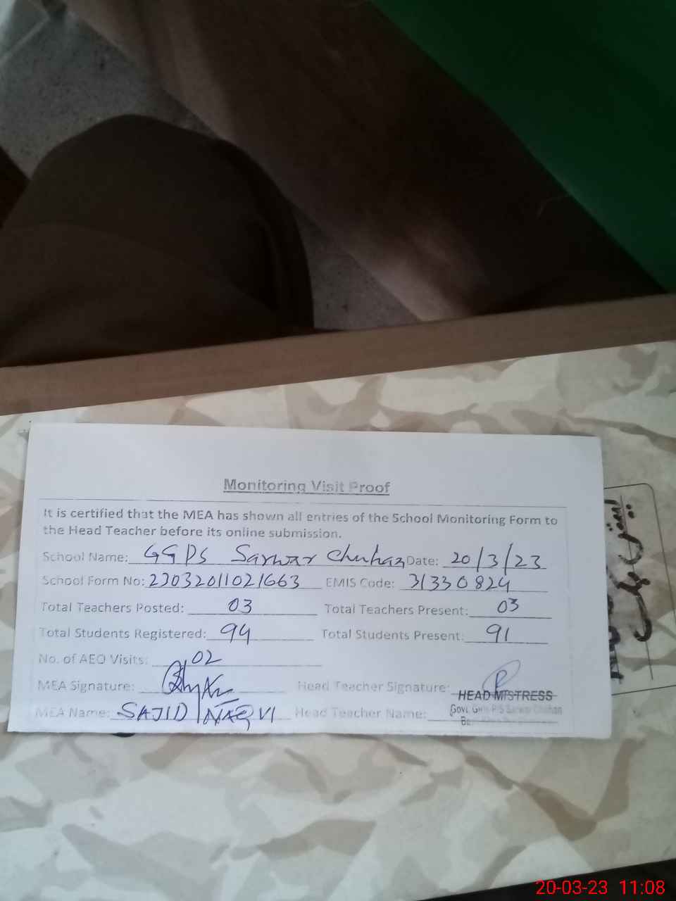 | Attendance Register | Head Teacher | MEA with School | Visit Proof |