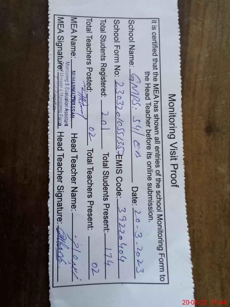| Attendance Register | Head Teacher | MEA with School | Visit Proof |