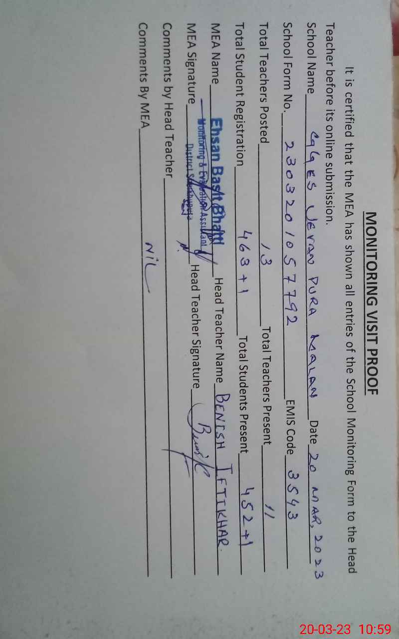 | Attendance Register | Head Teacher | MEA with School | Visit Proof |