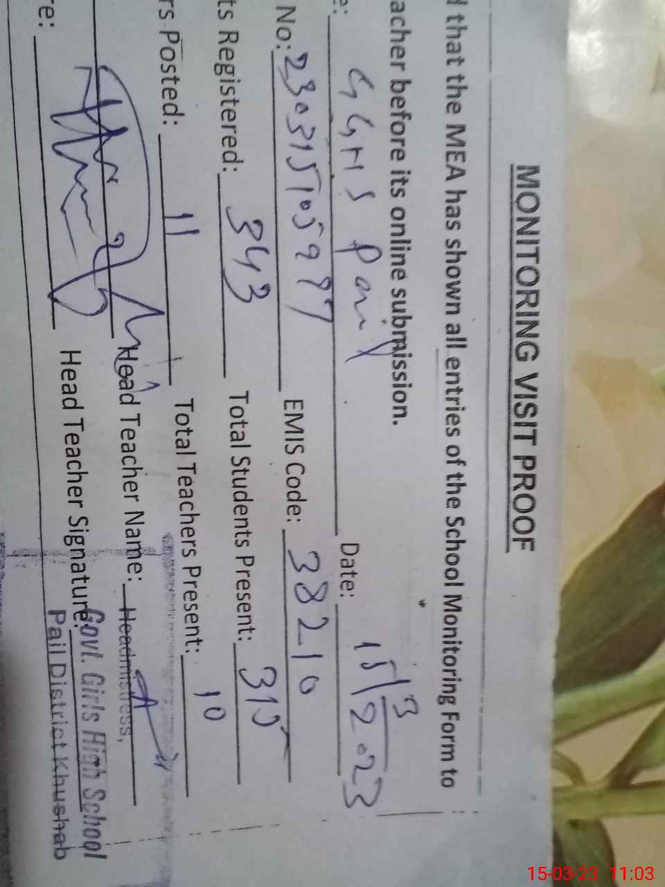 | Attendance Register | Head Teacher | MEA with School | Visit Proof |