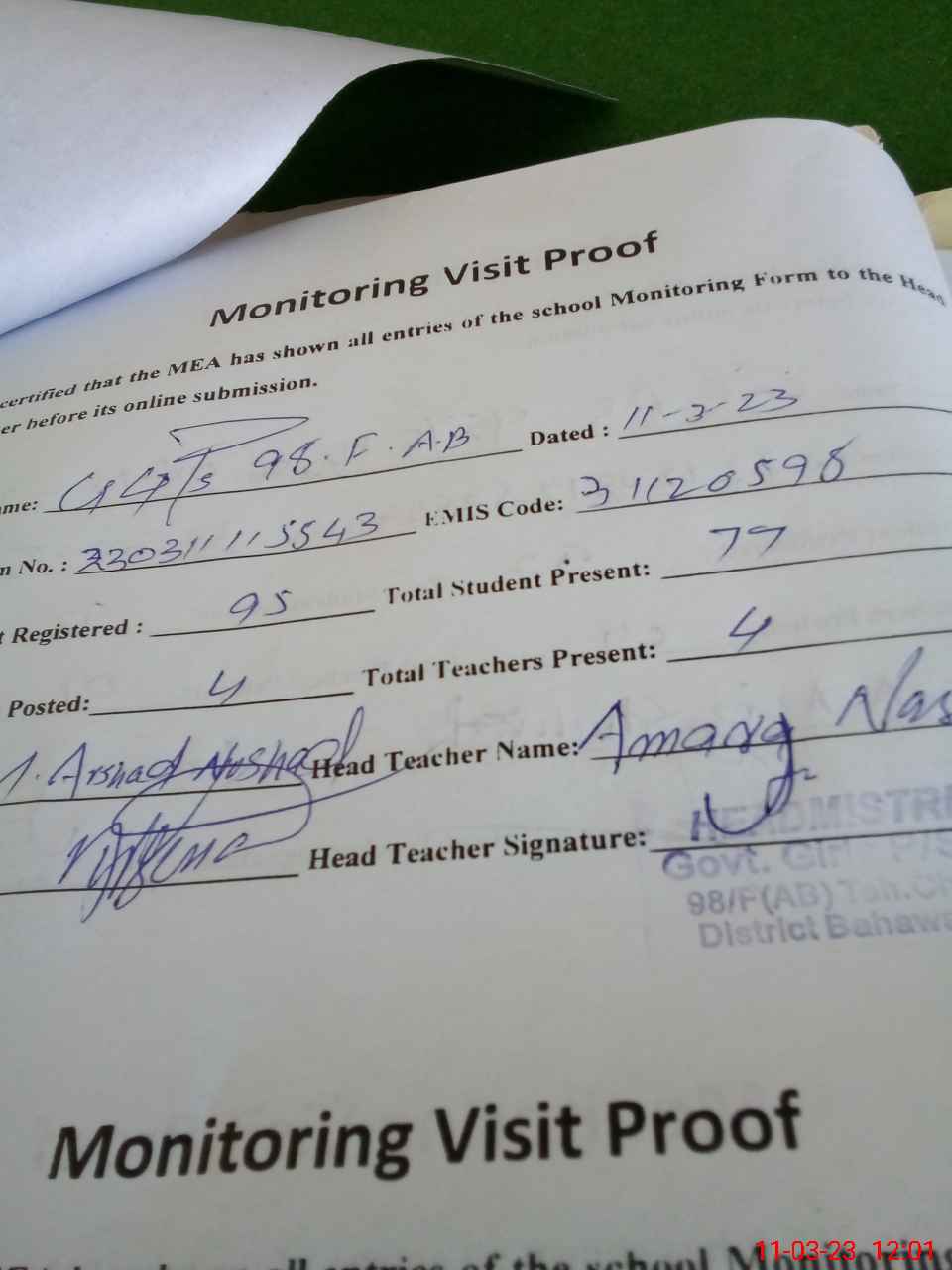 | Attendance Register | Head Teacher | MEA with School | Visit Proof |