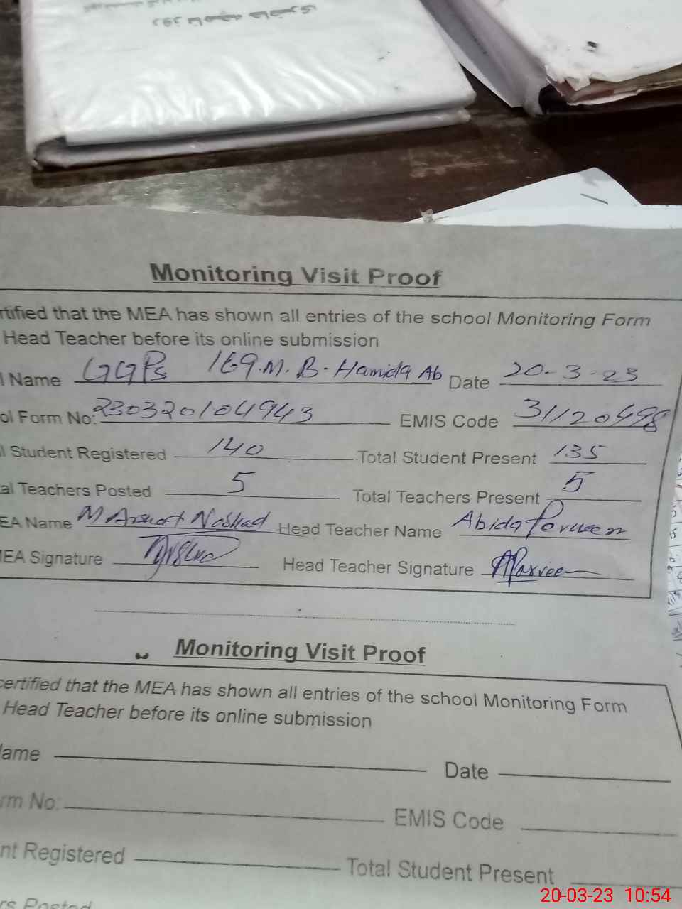 | Attendance Register | Head Teacher | MEA with School | Visit Proof |