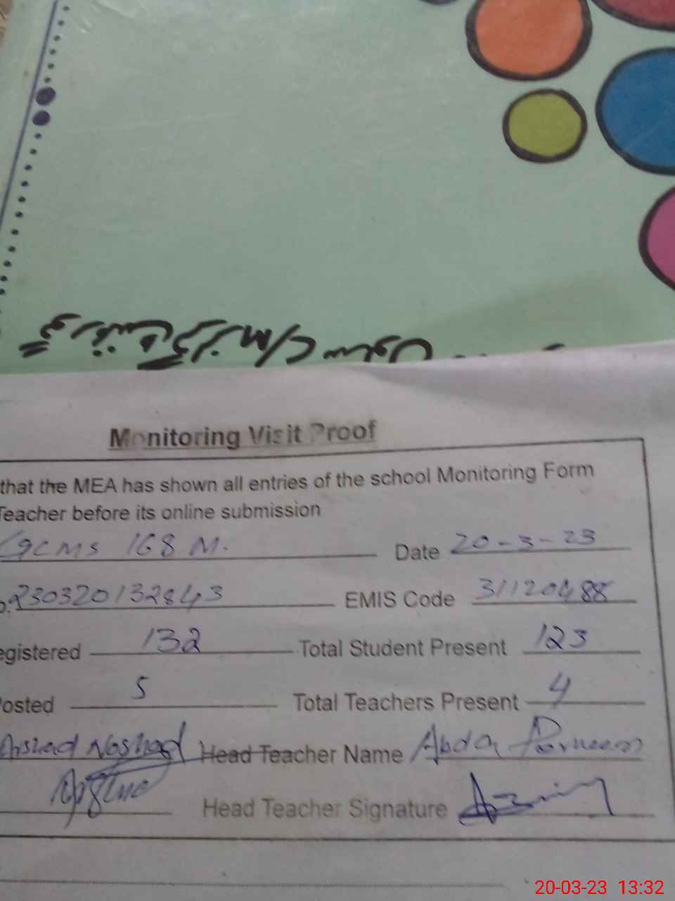 | Attendance Register | Head Teacher | MEA with School | Visit Proof |